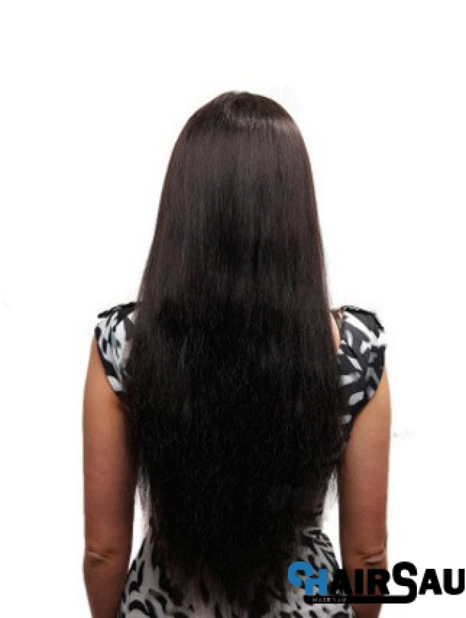 Straight Without Bangs 100% Hand-tied Sleek 26 inch Black Long Wigs